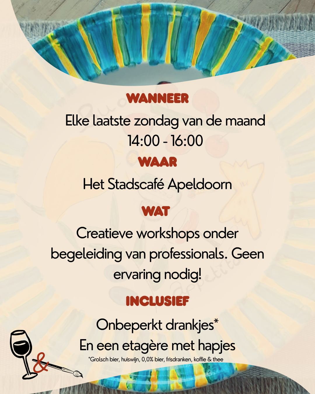 Onze 'Sip & Paint' bij het Stadscafé Apeldoorn biedt een bijzondere combinatie van creatief bezig zijn, gezelligheid onder het genot van een hapje en drankje . Ervaar het zelf!